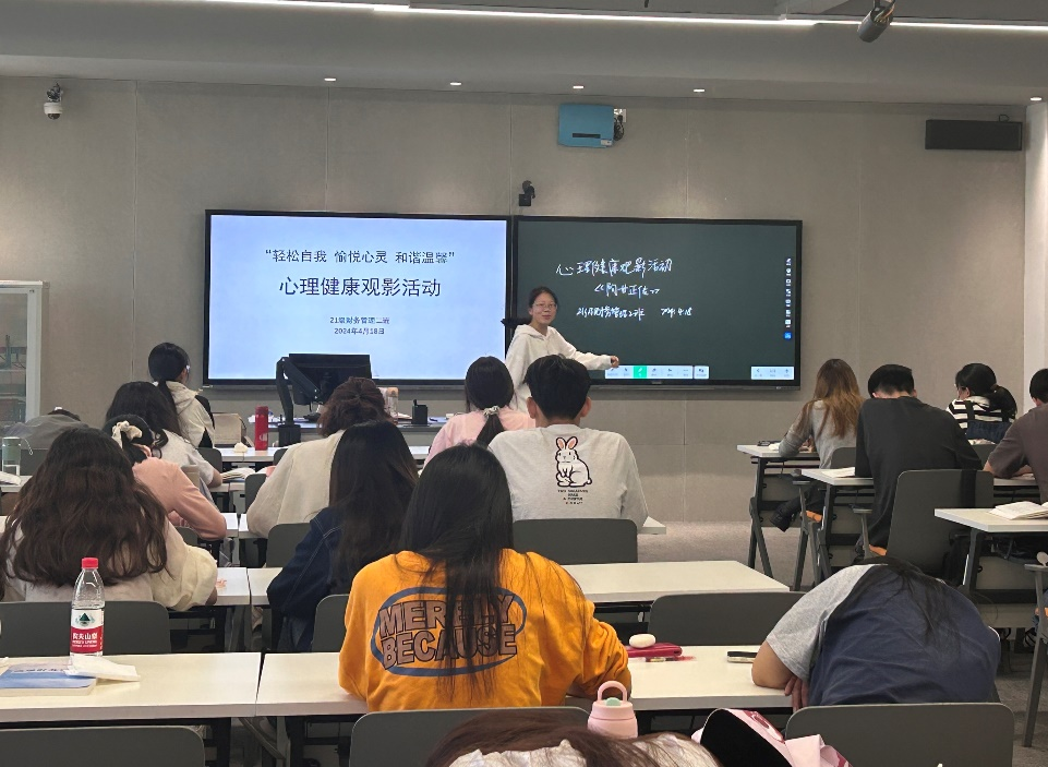4月19日上午,伟德官网21级财务管理专业二班的47名同学在北区智慧教室开展了“轻松自我 愉悦心灵 和谐温馨”心理健康观影活动,班长余楚岚主持流程。