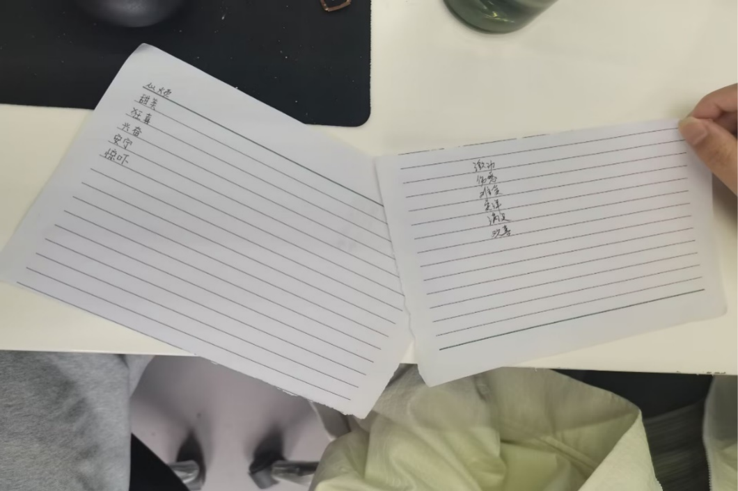 活动还安排了有趣的导入小游戏。在“词语大比拼”中,同学们书写出自己所了解的情绪,促进了他们对情绪种类的正确认识,通过了解情绪,人们能更深入地认识自己,理解自己的需求和感受。这种自我认知有助于建立更健康的自我形象,增强自信心。