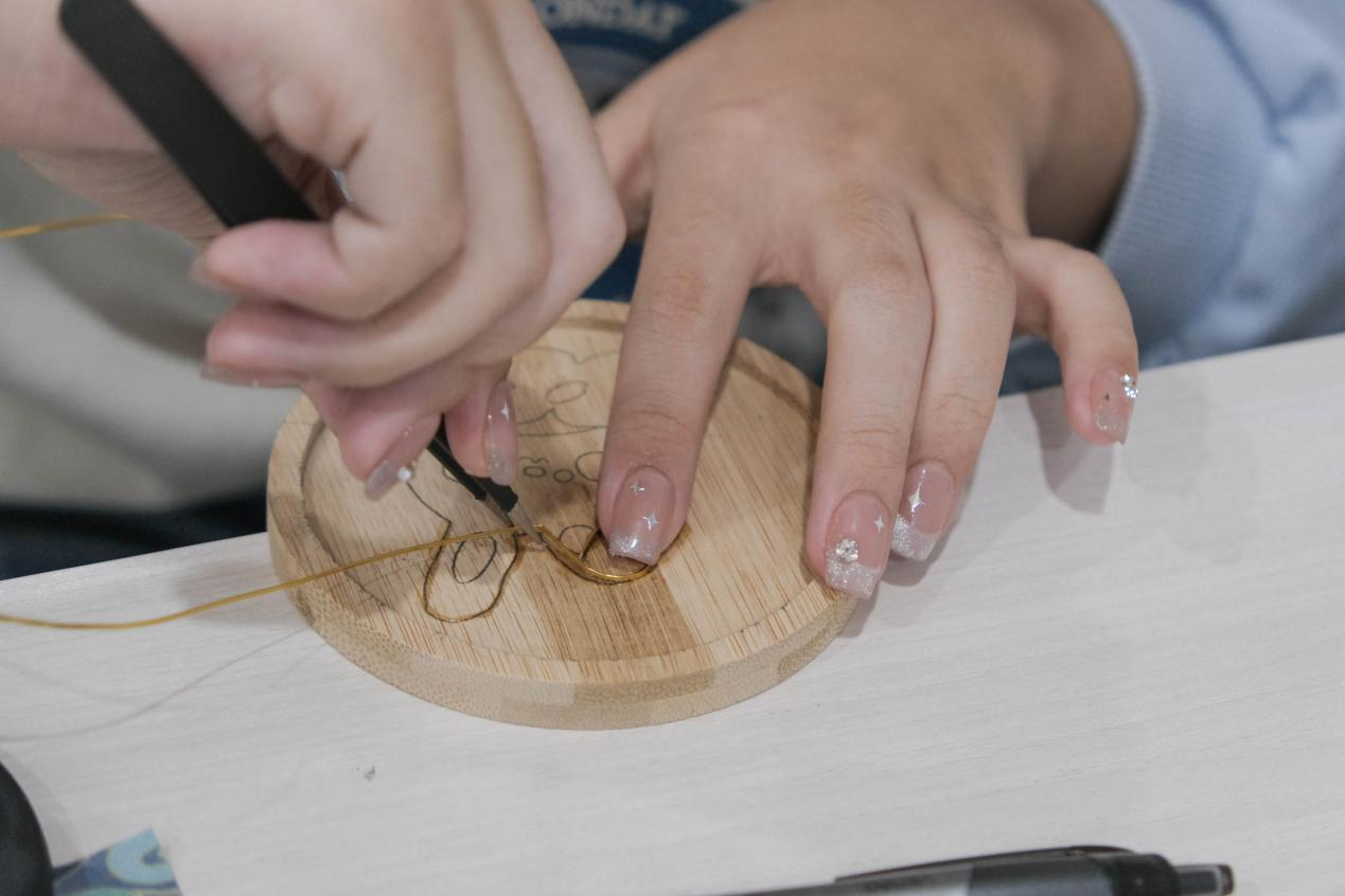 而“法琅传情”活动更是将传统文化与现代创意完美融合。同学们在工作人员的带领下,体验了掐丝法琅这一古老而精美的传统工艺。 他们小心翼翼地用细丝勾勒出图案的轮廓,然后填充上法琅釉料。每一件作品都蕴含着同学们对传统文化的热爱与传承,更传递着被此之间的温情与关怀。