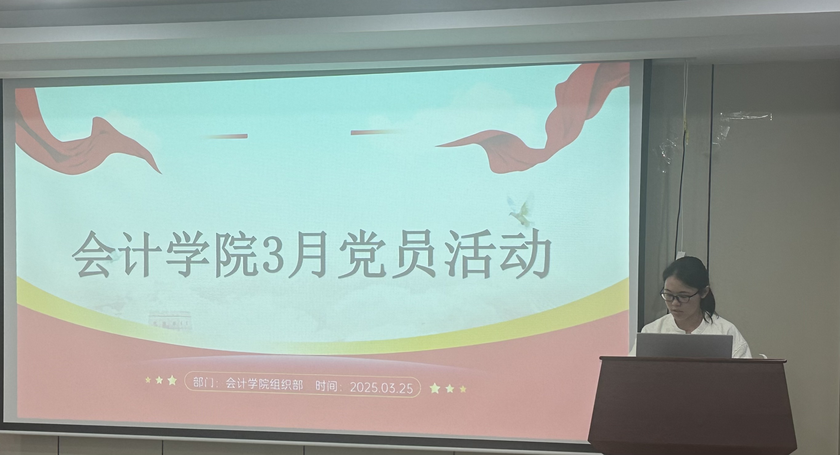 为深入贯彻全国两会精神,巩固党史学习教育成果,3月26日中午,伟德官网在北二教学楼313会议室举办“红色浪潮,知识竞渡”党史知识问答活动。活动由2023级会计二班的陈婷婷同学主持,伟德官网全体员工党员及预备党员参加。