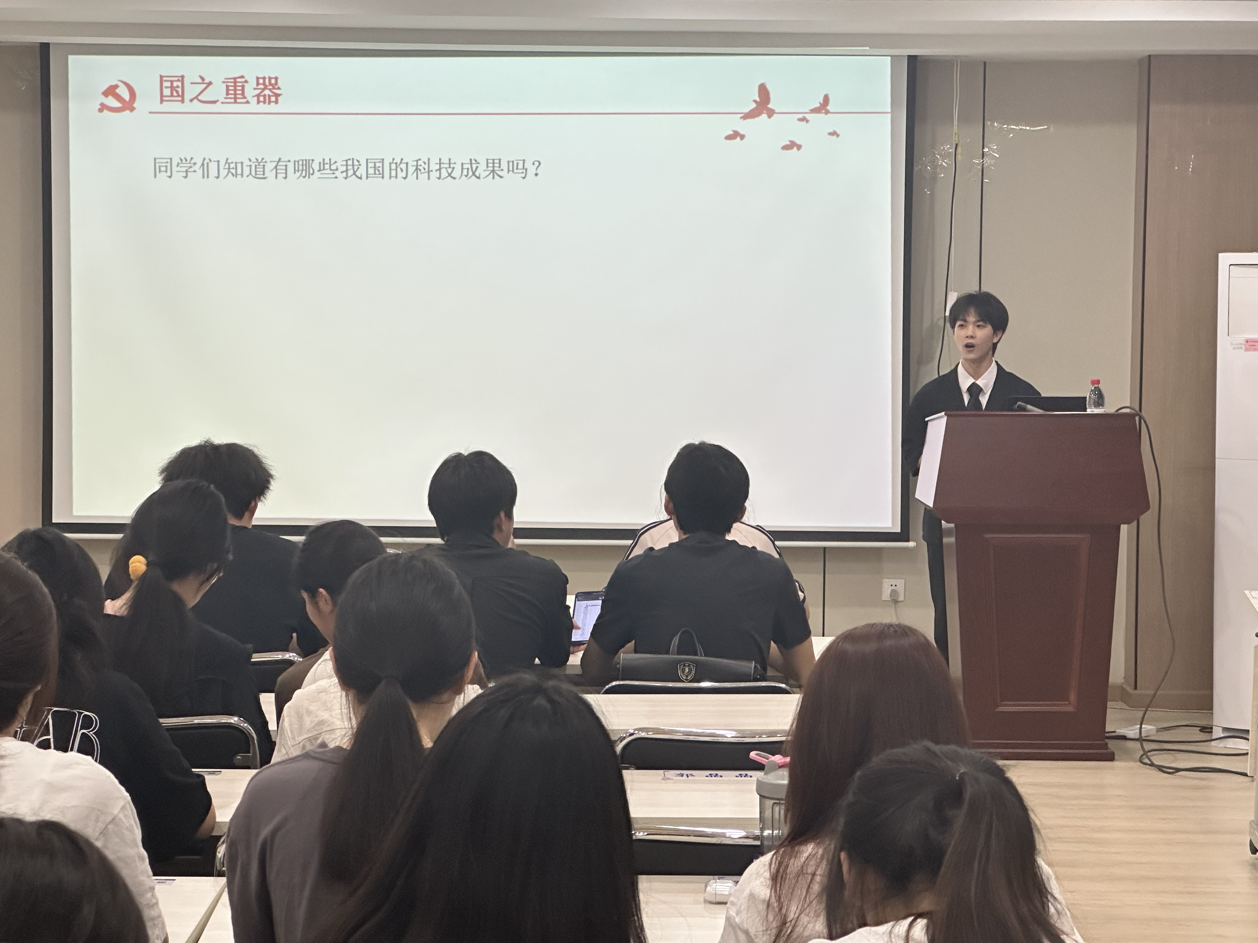 培训过程中,白文庭同学以一段精心准备、制作精良的视频作为开场,视频中详细展示了建国以来我国科技发展的关键历史节点与重要成果。从“两弹一星”的伟大突破,到载人航天的壮举,再到高铁技术的领先全球,每一个画面都凝聚着无数科研工作者的心血与汗水。白文庭同学声情并茂地进行讲解,带领大家一同回顾这些辉煌成就。他还积极与现场同学展开互动交流,精心设计了问答环节,同学们纷纷踊跃举手发言,现场气氛十分热烈。通过这一环节,进一步加深了同学们对我国科技发展的全面认知。