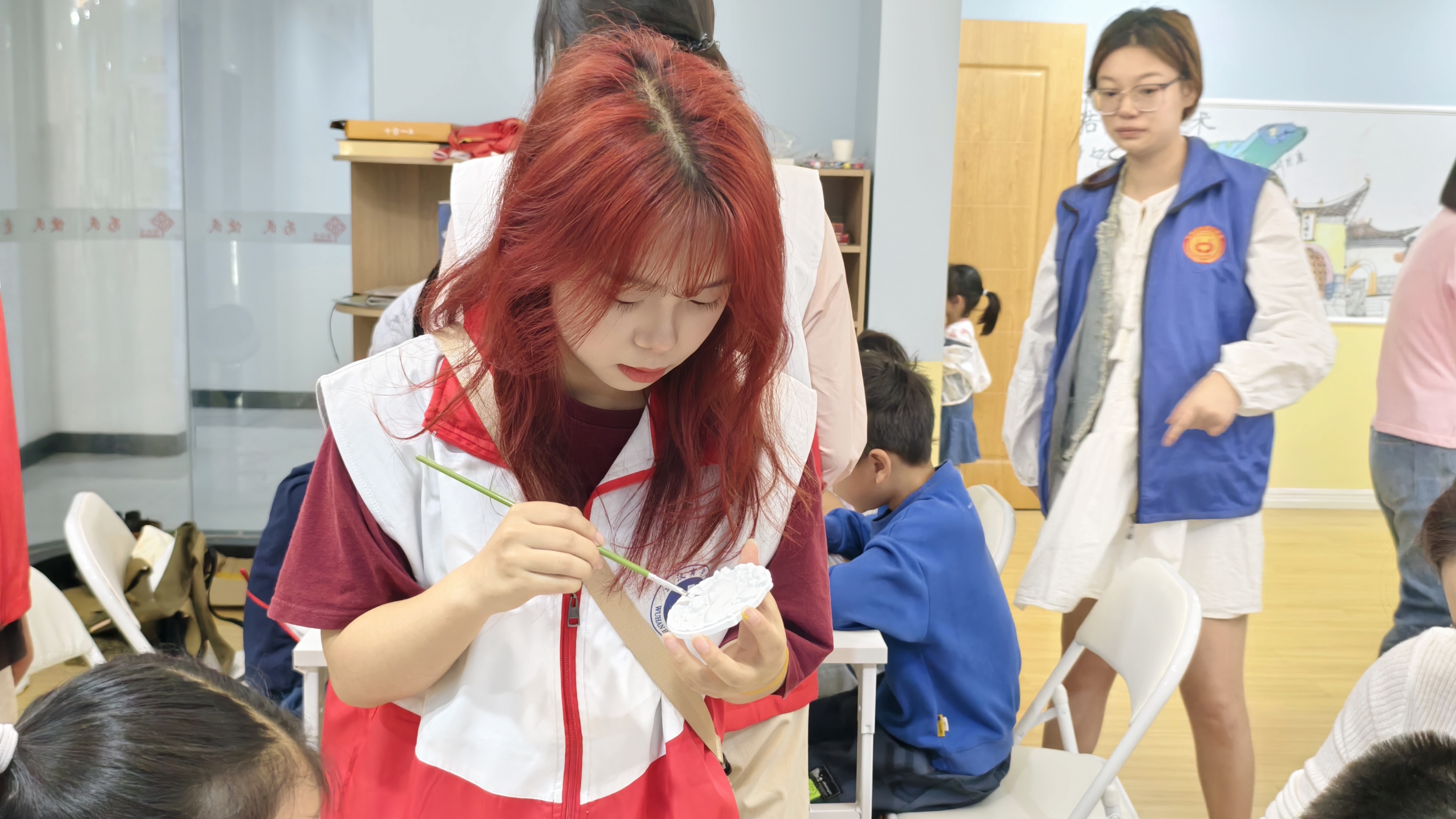 (志愿者演示如何给石膏娃娃上色)