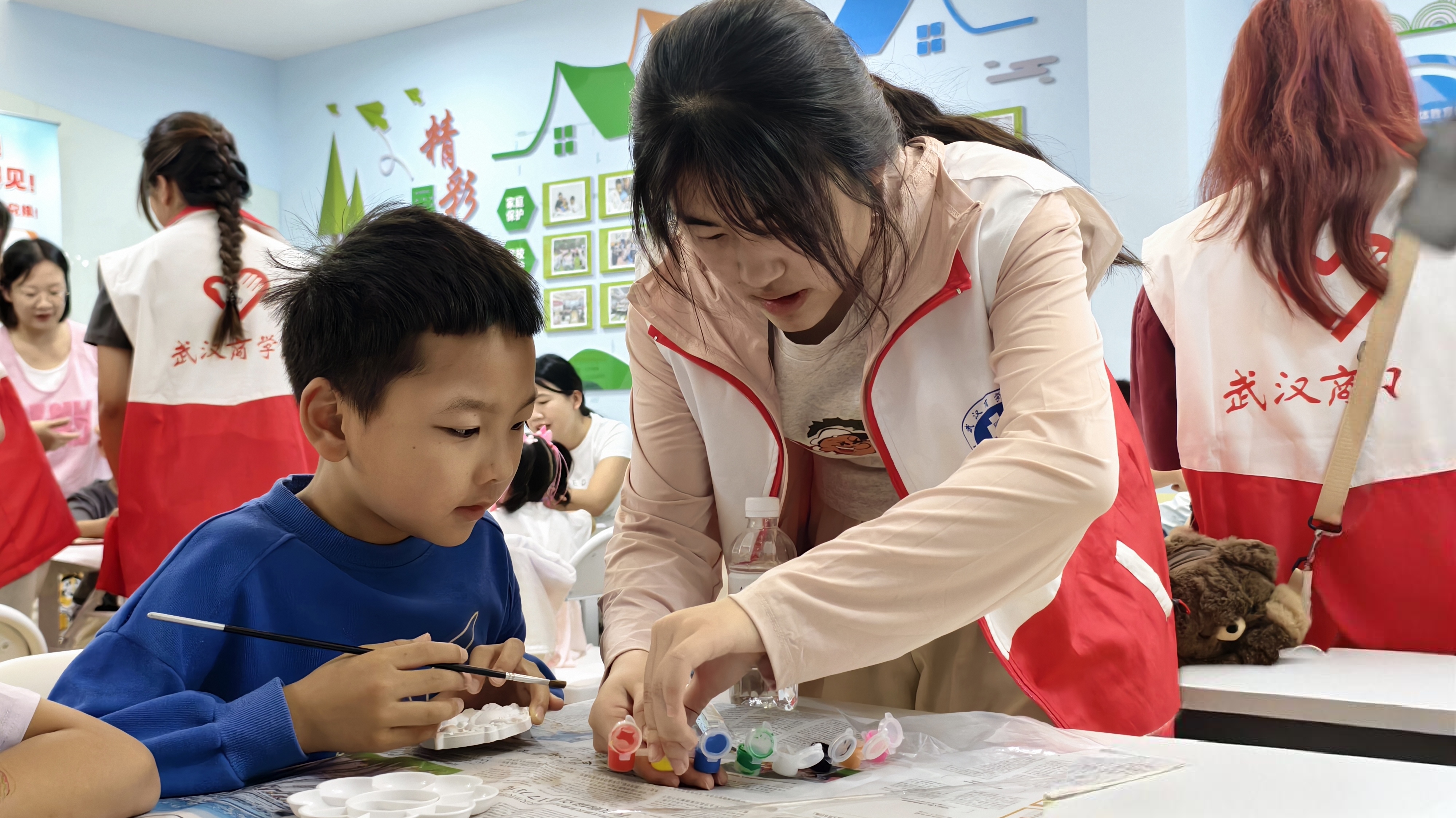 (志愿者给小朋友们分配颜料)