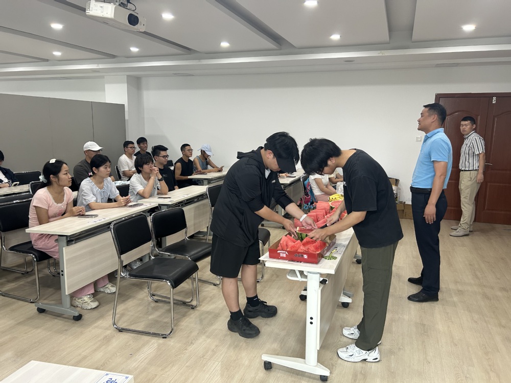 刘桢老师与舒靖钧老师也分别从学习规划、宿舍安全、生活细节等方面送上叮嘱:“暑期时间宝贵,既要抓紧学习,也要保证休息” ,“宿舍用电要规范,有任何困难随时找老师”。活动现场,方武书记为同学们分发清甜西瓜,红瓤绿皮间,驱散了夏日燥热,更传递着公司的贴心关怀。