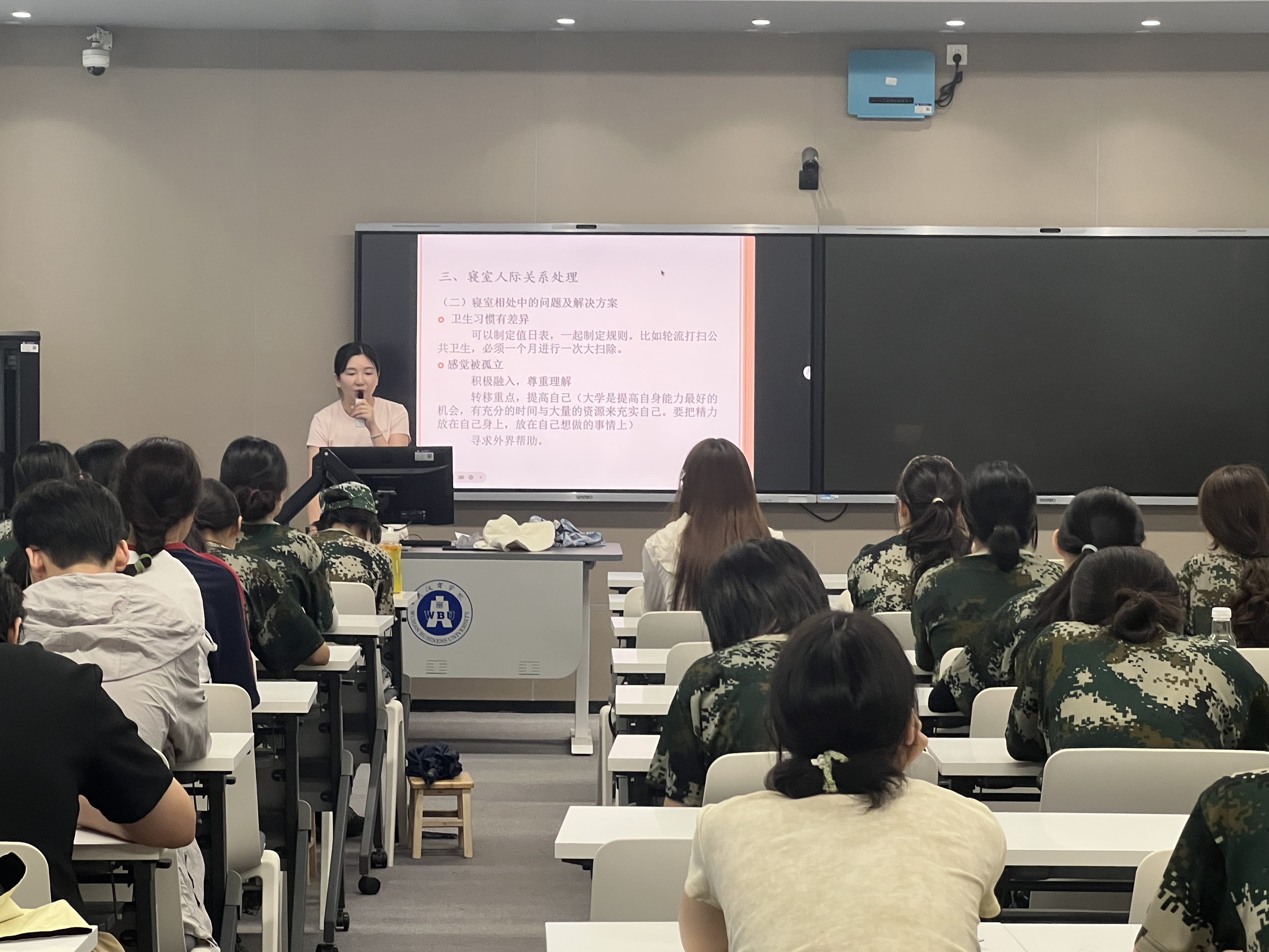 随后,王明丽老师针对新生常见的心理适应问题进行了心理健康教育和大学适应教育,帮助新生更好地应对新环境带来的挑战。并且针对新生常见的防诈骗安全、用电安全、防溺水安全、交通安全、军训防中暑安全等诸多安全事宜,王明丽老师都不厌其烦给新生做了温馨提示。