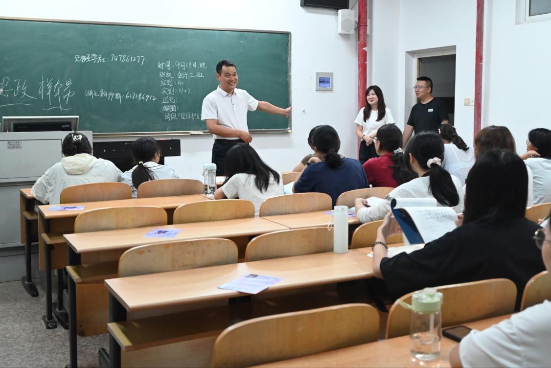 晚自习时分,方武书记以“开学第一节思政课”为核心,谈及“正三观”,其以918事变历史为简要参照:“从历史中更能懂‘小我融大我’的意义,要把爱国、求真刻进三观,让个人成长与家国发展同频。”针对“学做人”,结合会计专业“诚信为本”的底色,书记进一步点明:“先学做人再修学业,要以真诚待同学、以严谨对学业,这是会计人最基本的素养。”面对新生桌上的专业课本,书记最后聚焦“长知识”:“会计专业重基础,要珍惜此刻安静时光,把会计分录、财务准则学扎实,让知识成为未来立足的底气。”