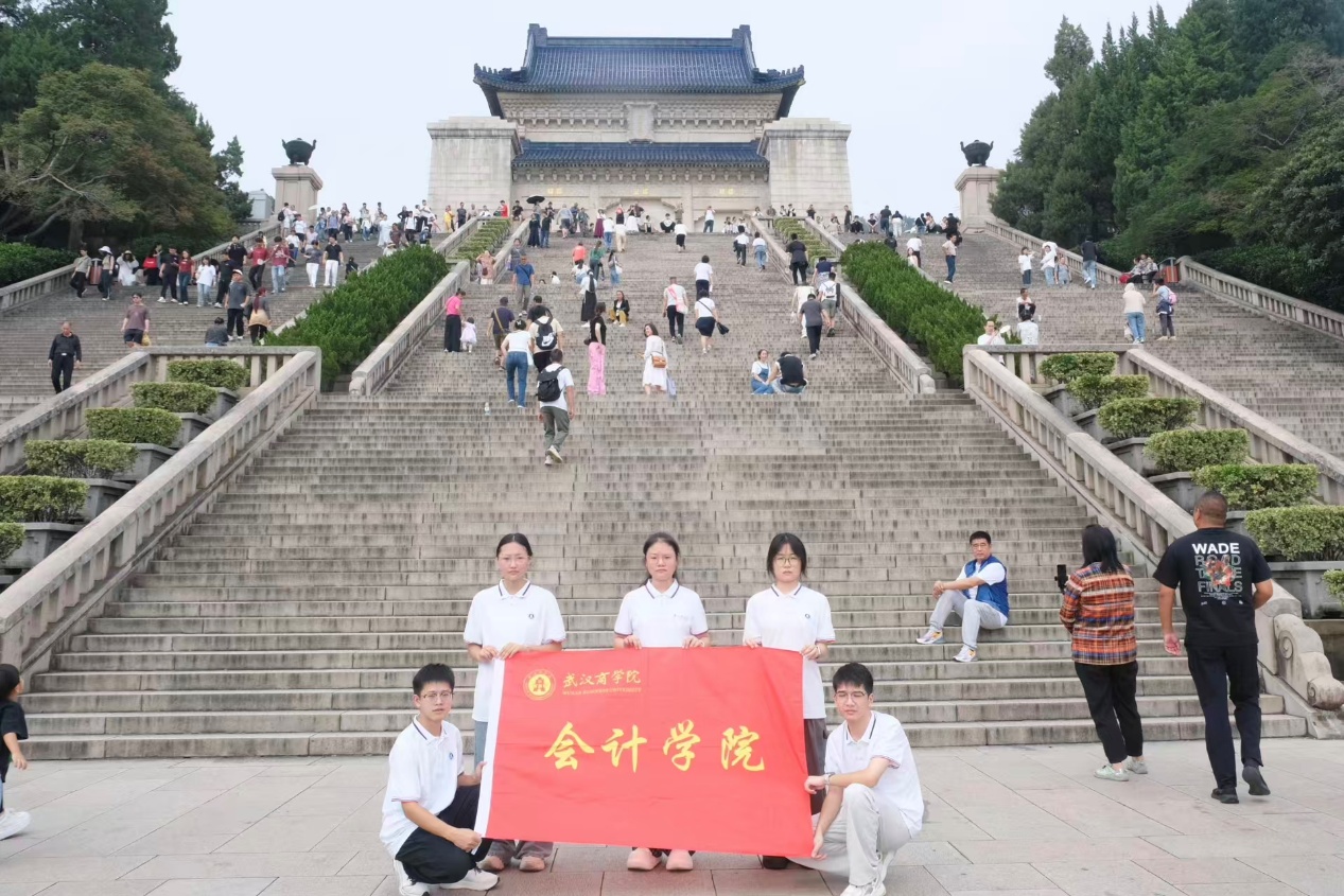 第三站,团队沿着392级台阶登上中山陵,每一步都承载着对革命先辈的缅怀。祭堂内“天下为公”的匾额光彩夺目,孙中山先生“革命尚未成功,同志仍须努力”的遗言,令会计学子深切感受到“救亡图存”的初衷与“强国建设”的使命。徐鹏同学在研学笔记里写道:“会计人注重‘责任与担当’,先辈们为民族独立担当的精神,正是我们日后在岗位上恪守准则、服务社会的精神源泉。”