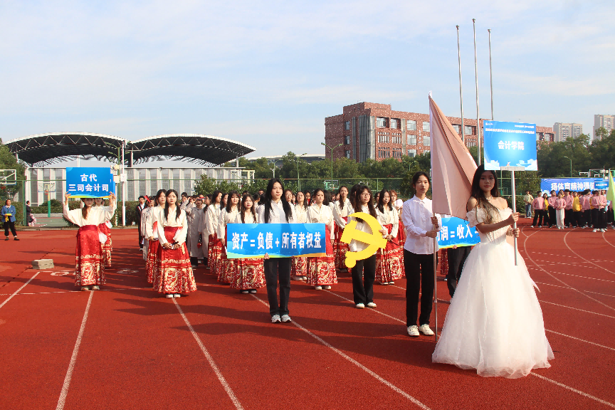 开幕式上,伴随着激昂的运动员进行曲,伟德官网方阵惊艳入场。身着马面裙、马褂、西服的学子依次列队,手持扇子、算盘与国旗,扇子色彩错落拼出“1963”字样,定格公司初心。音乐流转间,图案渐变“2024”,寓意创校时间和公司成立时间,薪火相传。方阵随即向两侧散开,中央学子起舞展活力,终了全体齐声高喊“会人一步,计高一筹,学以致用,院展宏图”的口号,以古今交融的创意,彰显会计人的奋进风采。