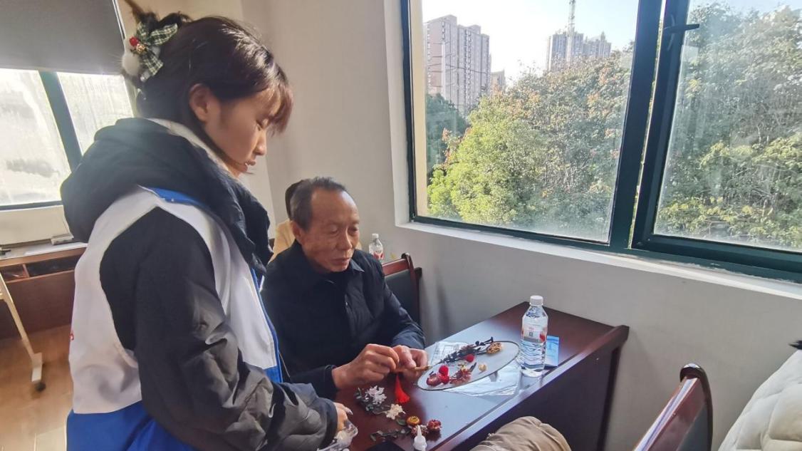 (志愿者帮助老人制作团扇)