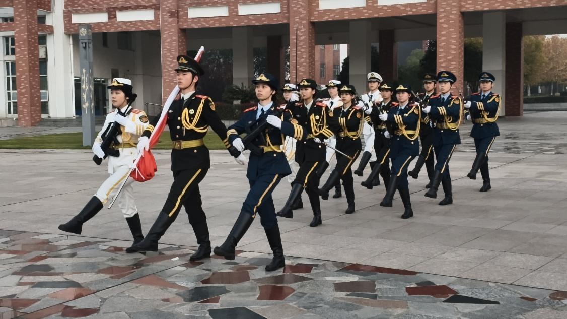 晨光熹微,嘹亮的口号声传进耳廓,仪仗队的队员们步履矫健、身姿挺拔,庄严地护卫着国旗缓缓行至升旗台。在满怀崇敬的目光中,五星红旗随着激昂的国歌节奏缓缓升起,随风招展。现场的学子们端庄肃立,目不斜视地注视国旗,传递着对祖国深沉的爱意和无尽的敬仰。