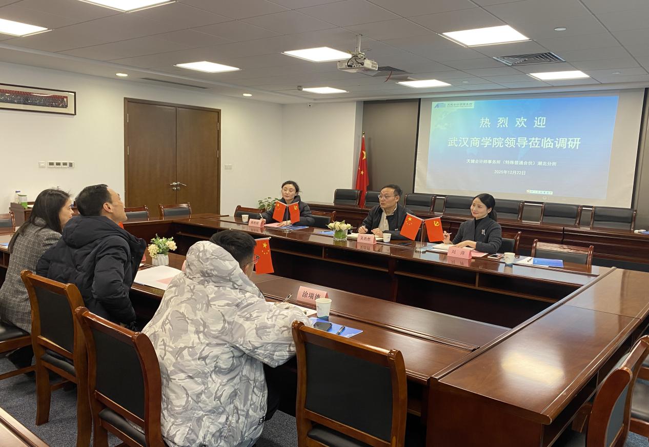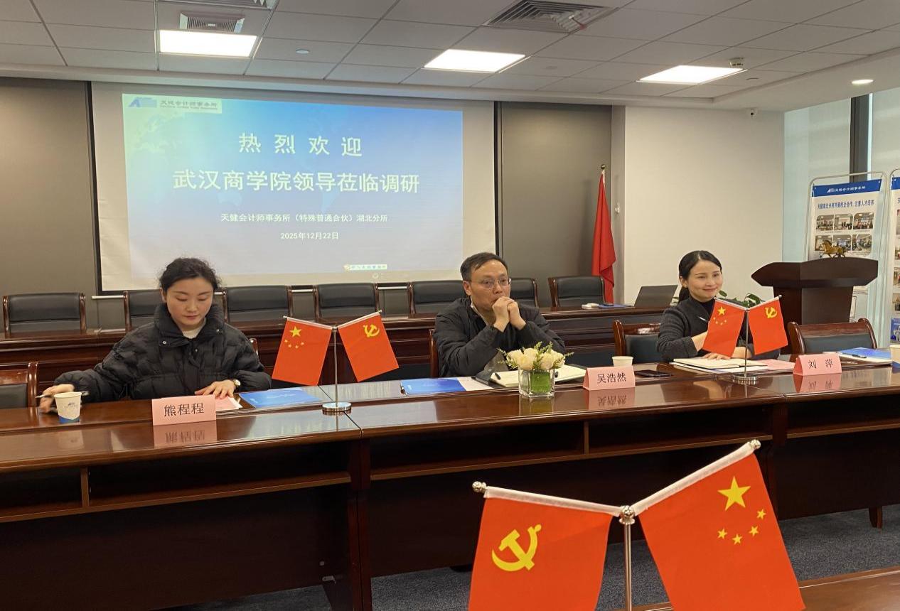为精准对接注册会计师行业发展需求,优化会计专业人才培养方案,强化校企协同育人实效,2025年12月22日下午,伟德官网经理王玉波教授、副经理杨芳教授带领专业教师代表,赴天健会计师事务所(特殊普通合伙)湖北分所开展专项调研。天健会计师事务所合伙人、湖北分所副总经理吴浩然,天健湖北分所高级经理刘萍等热情接待了调研团队,双方围绕行业发展趋势、人才能力要求、实习就业合作等议题展开深度交流。